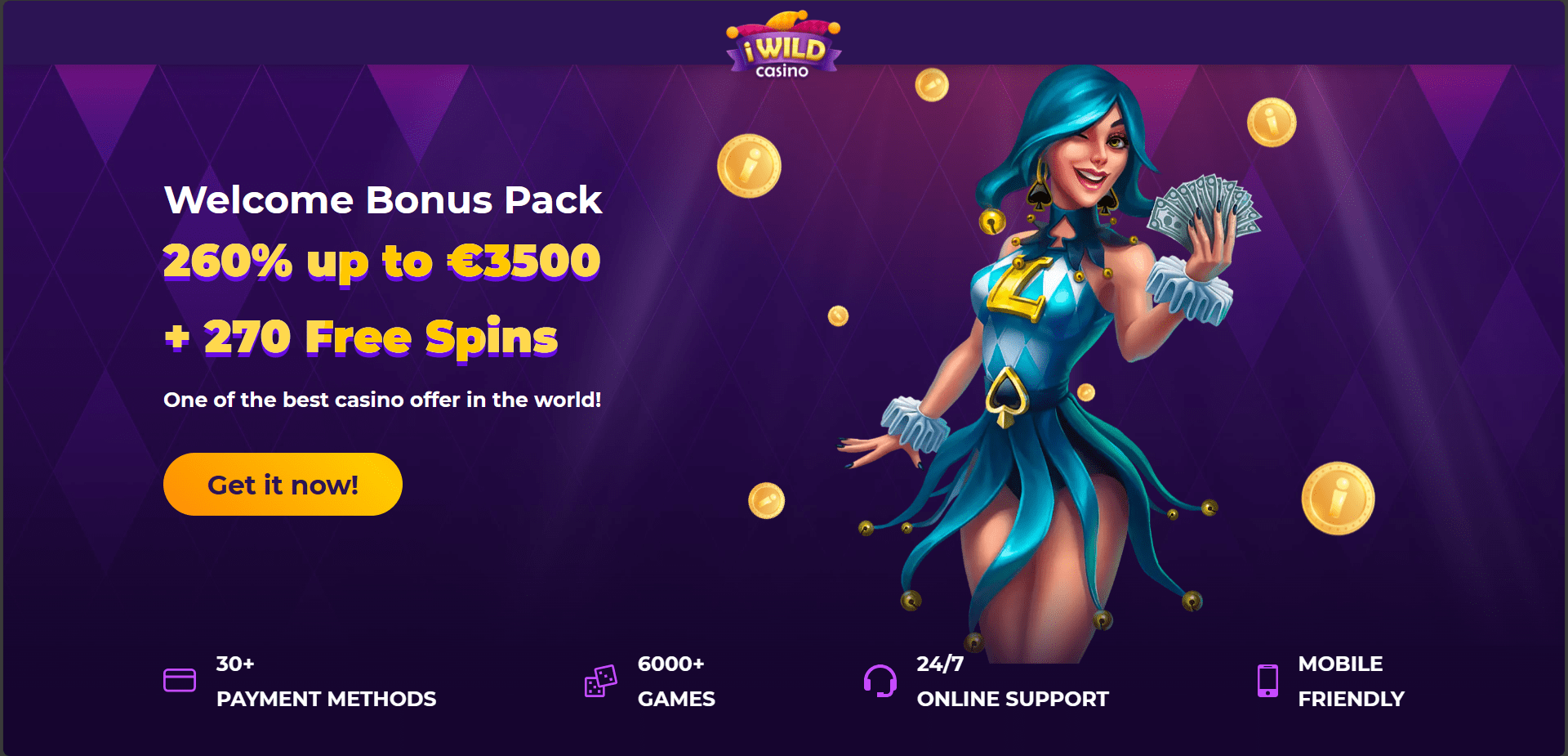 iWild Casinolla on valtava tervetuliaispaketti, joka on jopa 35000 Nokin ja 270 ilmaiskierrosta ensimmäisellä 4 talletuksella. Tarjolla on myös keskiviikkobonus, viikonlopun uudelleenlatausbonus, viikoittainen käteispalautus, kanta-asiakasohjelma ja VIP-ohjelma.
